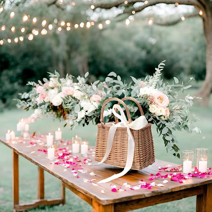 Flower Girl Basket Boho Style Rattan Baskets with White Ribbon for Weddings, Classic Wicker Handbag Basket Purse Baskets Bags Women Straw Tote with Handle